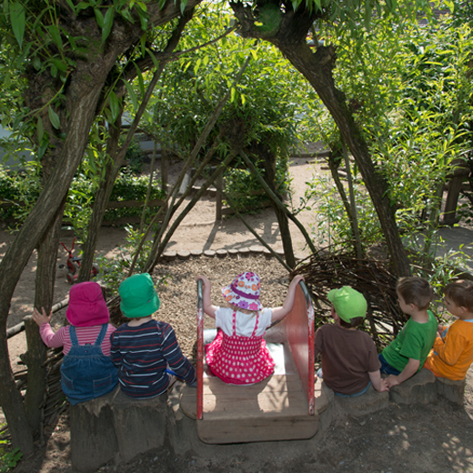 Weidentippis und Häuschen laden zu ungestörten Rollenspielen ein, Büsche und Hecken zum Verstecken oder um Geheimnisvolles zu verbergen oder einfach eine Rückzugsmöglichkeit zum Ausruhen und Entspannen.