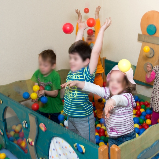 Einen Mehrzweckraum von ca. 25 qm zwischen den Gruppenräumen, mit Bällebecken und Podesten.